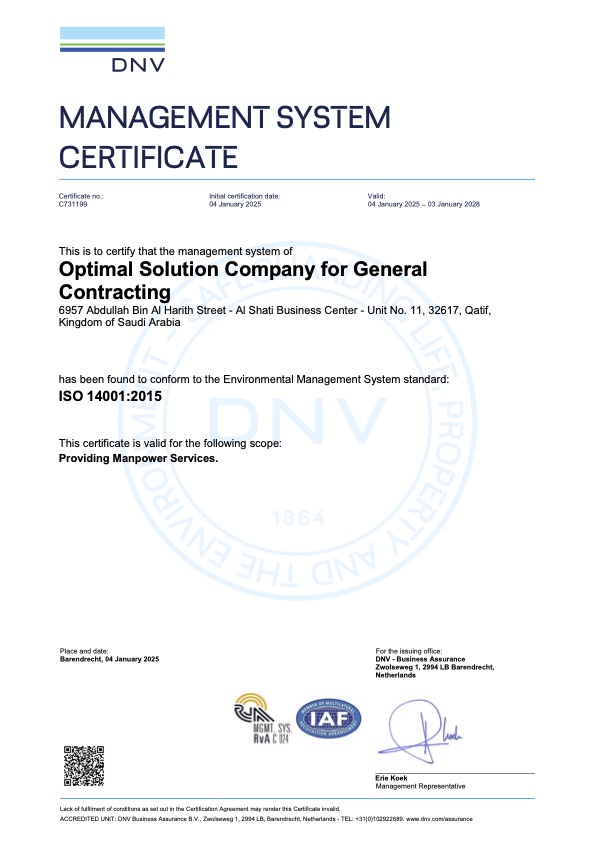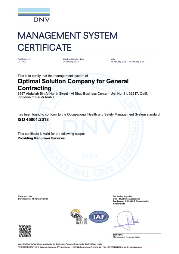 Optimal Solution is a premier manpower organization based in the Kingdom of Saudi Arabia, known for excellence, reliability, and deep expertise in manufacturing. We provide high-quality staffing solutions tailored to meet the unique needs of the manufacturing sector, and as part of our commitment to excellence, we are certified in ISO 9001 (Quality Management), ISO 14001 (Environmental Management), and ISO 45001 (Occupational Health and Safety), ensuring our operations meet the highest international standards.